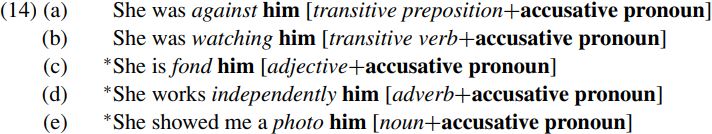 A further syntactic property of some prepositions (namely those which take a following noun or pronoun expression as their complement – traditionally called transitive prepositions) which they share in common with (transitive) verbs is the fact that they permit an immediately following accusative pronoun as their complement (i.e. a pronoun in its accusative form, like me/us/him/them):