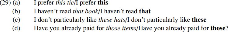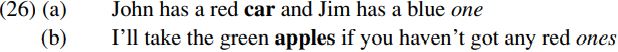 From a grammatical perspective, one behaves like a regular count noun here in that it has the s-plural form ones and occurs in a position (after an adjective like blue/red) in which a count noun could occur. However, it is a pronoun in the sense that it has no descriptive content of its own, but rather takes its descriptive content from its antecedent (e.g. one in (26a) refers back to the noun car and so one is interpreted as meaning ‘car’). Let’s refer to this kind of pronoun as an N-pronoun (or pronominal noun).