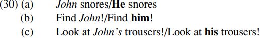 Personal pronouns like he/him/his and nouns like John/John’s change their morphological form according to the position which they occupy within the sentence, so that the nominative forms he/John are required as the subject of a finite verb like snores, whereas the accusative forms him/John are required when used as the complement of a transitive verb like find (or when used as the complement of a transitive preposition), and the genitive forms his/John’s are required (inter alia) when used to express possession: these variations reflect different case forms of the relevant items.