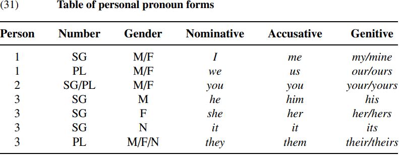Personal pronouns are functors by virtue of lacking descriptive content: whereas a noun like dogs denotes a specific type of animal, a personal pronoun like they denotes no specific type of entity, but has to have its reference determined from the linguistic or non-linguistic context. Personal pronouns encode the grammatical properties of (first, second or third) person, (singular or plural) number, (masculine, feminine or neuter/inanimate) gender and (nominative, accusative or genitive) case, as shown in the table in (31) below: