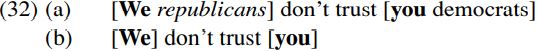Since we and you in (32a) modify the nouns republicans/democrats and since determiners like the are typically used to modify nouns, it seems reasonable to suppose that we/you function as prenominal determiners in (32a). But if this is so, it is plausible to suppose that we and you also have the categorial status of determiners (i.e. D-pronouns) in sentences like (32b).