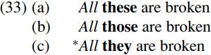 Such a contrast is unexpected if personal pronouns like they are D-pronouns like those/these, and clearly raises questions about the true status of personal pronouns (an issue which we leave open here).