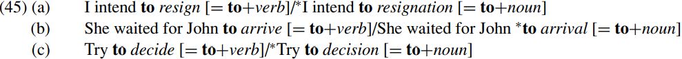 Moreover, what makes the prepositional analysis of infinitival to even more problematic is that it takes a different range of complements from prepositional to (and indeed different from the range of complements found with other prepositions). For example, prepositional to (like other prepositions) can have a noun expression as its complement, whereas infinitival to requires a verbal complement: