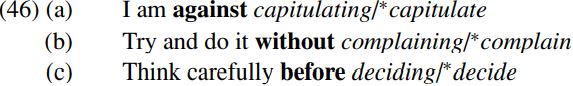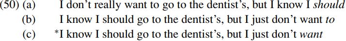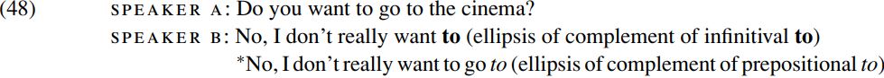 A further difference between infinitival and prepositional to (illustrated in (48) below) is that infinitival to permits ellipsis (i.e. omission) of its complement, whereas prepositional to does not: