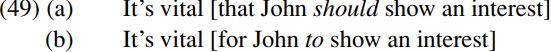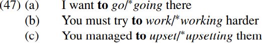 We see from (49) that to and should are both positioned between the subject John and the verb show. Moreover, just as should requires after it a verb in the infinitive form (cf. ‘You should show/∗showing/∗shown more interest in syntax’), so too does infinitival to (cf. ‘Try to show/∗showing/∗shown more interest in syntax’). Furthermore, infinitival to behaves like typical auxiliaries (e.g. should) but unlike typical non-auxiliary verbs (e.g. want) in allowing ellipsis of its complement: