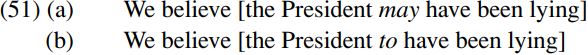 In (51a), the bracketed complement clause has a present-tense interpretation (para-phraseable as ‘We believe it is possible that the President has been lying’): this is because it contains the present-tense auxiliary may. However, the bracketed infinitive complement clause in (51b) can also have a present-tense interpretation, paraphraseable as ‘We believe the President has been lying.’ Why should this be? A plausible answer is that infinitival to carries Tense in much the same way as an auxiliary like may does. In a sentence like (51b), to is most likely to be assigned a present-tense interpretation. However, in a sentence such as (52) below: