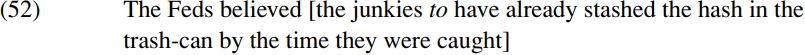 infinitival to seems to have a past-tense interpretation, so that (52) is para-phraseable as ‘The Federal Agents believed the junkies had already stashed the hash in the trash-can by the time they were caught.’ What this suggests is that to has abstract (i.e. invisible) tense properties, and has a present-tense interpretation in structures like (51b) when the bracketed to-clause is the complement of a present-tense verb like believe, and a past-tense interpretation in structures like (52) when the bracketed to-clause is the complement of a past-tense verb like believed. If finite auxiliaries and infinitival to both have (visible or invisible) tense properties, we can assign the two of them to the same category of T/Tense marker – as is done in much contemporary work. The difference between them is sometimes said to be that auxiliaries carry finite tense (i.e. they are overtly specified for tense, in the sense that e.g. does is overtly marked as a present-tense form and did as a past-tense form) whereas infinitival to carries non-finite tense (i.e. it has an unspecified tense value which has to be determined from the context. For a more technical discussion of tense, see Julien 2001.)