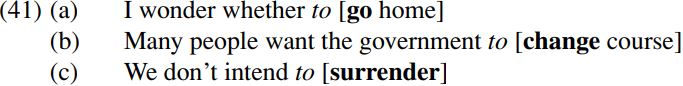 A fourth type of functor found in English is the infinitive particle to – so called because the only kind of complement it allows is one containing a verb in the infinitive form (the infinitive form of the verb is its uninflected base form, i.e. the citation form found in dictionary entries). Typical uses of infinitival to are illustrated in (41) below: