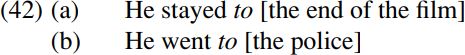 In (42), to behaves like a typical (transitive) preposition in taking a [bracketed] the-phrase (i.e. determiner phrase) as its complement (viz. the end of the film and the police). It might therefore seem that to is a preposition in both uses – one which takes a following determiner phrase complement (i.e. has a determiner expression as its complement) in (42) and a following verbal complement in (41).