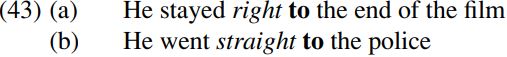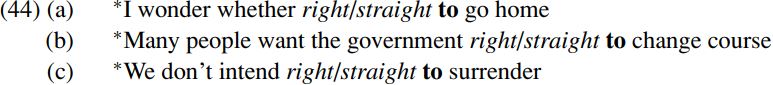 By contrast, infinitival to (because of its lack of lexical content) cannot be intensified by right/straight: