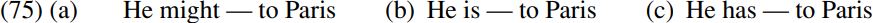 A categorial answer would be ‘A verb’. However, we can’t just use any verb: for example, it’s OK to use verbs like go/fly, but not verbs like find/stay. This is because different verbs select (i.e. ‘take’) different types of complement, and verbs like go/fly select a to-expression as their complement but verbs like find/stay do not. But the story doesn’t end there, since each of the structures in (75) requires a different form of the verb: in (75a) we can use the infinitive form go, but not other forms of the verb (cf. He might go/∗going/∗gone/∗goes/∗went to Paris); in (75b) we can only use the progressive participle form going (cf. He is going/∗go/∗gone/∗goes/ ∗went to Paris); and in (75c) we can only use the perfect participle form gone (cf. He has gone/∗go/∗going/∗goes/∗went to Paris). This in turn is because the auxiliary might selects (i.e. ‘takes’) an infinitive complement, the progressive auxiliary is selects a progressive participle complement, and the perfect auxiliary has selects a perfect participle complement. In other words, a full description of the grammatical properties of words requires us to specify not only their categorial and subcategorial properties, but also their selectional properties. It is widely assumed that the selectional properties of words can be described in terms of selectional features. For example, the fact that progressive be selects a progressive participle complement might be described by saying that it has the selectional feature [V-ing] – a notation intended to signify that it selects a complement headed by a verb carrying the -ing suffix.