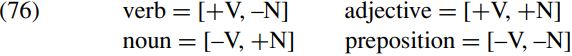 As far back as his 1965 book Aspects of the Theory of Syntax, Chomsky argued that all the grammatical properties of a word (including its categorial properties) can be described in terms of a set of grammatical features. In work in the 1970s, he argued that the categorial distinction between nouns, verbs, adjectives and prepositions can be handled in terms of two sets of categorial features, namely [±V] ‘verbal/non-verbal’ and [±N] ‘nominal/non-nominal’. More specifically, he suggested that the categorial properties of nouns, verbs adjectives and prepositions could be described in terms of the sets of features in (76) below: