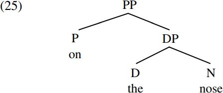 (In work in the 1960s and 1970s, expressions like the nose were taken to have the categorial status of a NP/noun phrase; but here we follow more recent work dating from Abney 1987 which takes them to have the status of a DP/determiner phrase.) The preposition on is then merged with the resulting DP the nose to form the prepositional phrase/PP on the nose, which has the structure (25) below: