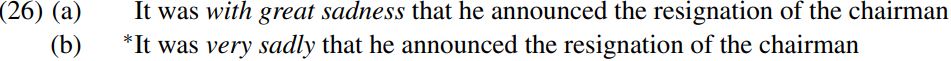 A prepositional phrase/PP like with great sadness can be focused in a cleft sentence, but not an adverbial phrase/ADVP like very sadly. In the light of this observation, consider the sentences below: