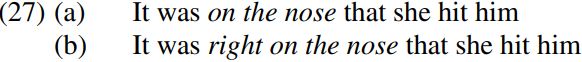 The fact that both on the nose and right on the nose can occupy focus position in a cleft sentence suggests that both are PP/prepositional phrase constituents: right on the nose cannot be an ADVP/adverbial phrase since we see from (26b) above that adverbial expressions cannot be focused in cleft sentences.