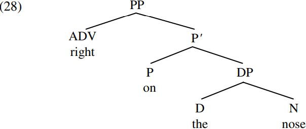 (or P-bar, pronounced ‘pee-bar’); the resulting P-bar on the nose is then merged with the adverb right to form the PP below: