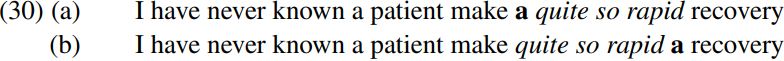 Modifiers in English are typically positioned between a determiner like a and a noun like recovery – and indeed this is the case with the modifying expression quite so rapid in (30a). However, in expressions like quite so rapid which contain a degree word like so/too/how, the whole degree expression can instead be positioned in front of a determiner like a – as in (30b). What syntactic position does the degree expression occupy in such cases? We can give a principled answer to this question if we assume that determiners can project into determiner phrases, since we can then say that a degree expression positioned in front of a determiner occupies spec-DP – i.e. the specifier position within the determiner phrase. On this view, (30b) would have the skeletal structure shown below (where we follow Abney 1987 in taking an expression like quite so rapid to be a projection of the DEG/degree word so, and hence to be a DEGP constituent):