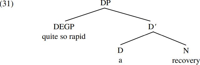 An analysis like (31) would mean that there is symmetry between the structure of determiner phrases and other types of phrase, in that (like other phrases), DPs allow a specifier of an appropriate kind. Indeed, although its internal structure is not shown in (31), the DEGP quite so rapid could be argued to have a similar specifier+ head+ complement structure, with the degree word so serving as its head, the adjective rapid as its complement, and the adverb quite as its specifier.