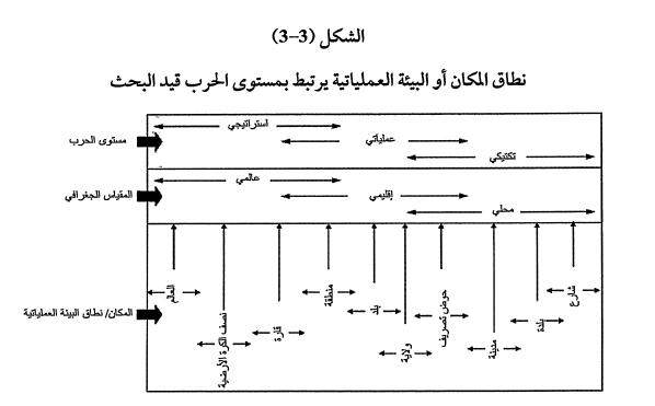 إن الأمكنة فريدة من نوعها، وتظهر مزايا طبيعية وثقافية منفصلة تميزها عن غيرها من الأمكنة الأخرى. وهذا أمر مهم للمختص بالجغرافيا العسكرية لأن سماتها تعطي أهمية استراتيجية وعملياتية وتكتيكية للأمكنة، وتمنحها الطابع والإمكانية والمعنى (1966 Peltier and Pearcy). والجغرافيون العسكريون معنيون بتحديد السمات التفصيلية للأمكنة وتحليلها، ولاسيما في معرفة الترابط بين المشهدين الطبيعي والبشري, لقد أثبتت دراسة الجغرافيا أن الأمكنة لها أهمية. فكل مكان هو مكان فريد ويظهر مجموعة متميزة من الضرورات الجغرافية. علاوة على ذلك، فإن الأمكنة تتفاعل فيها بينها، وبالتالي فإنها تخلق ديناميات وظروف قهرية وأحيانا صعبة يتحتم على الوحدات العسكرية العمل فيها. ويعتبر الجغرافيون العسكريون عادة الأمكنة بيئات عمل عسكرية، تتأثر كل واحدة منها بترابط مجموعة متميزة من المتغيرات الجغرافية. ونطاق المكان، بالمعنى العسكري، يرتبط بمستوى الحرب المنفذة (انظر الشكل 3-3).