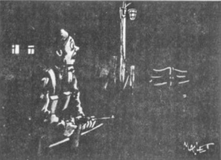 There is usually a guard composed of several soldiers at each gate, and the men in the guard take turns to stand at the gate with a gun and stop everyone who wants to go in or out to see their passes. The man on guard is told to say, 'Halt! Who goes there?" if anyone comes towards the gate.