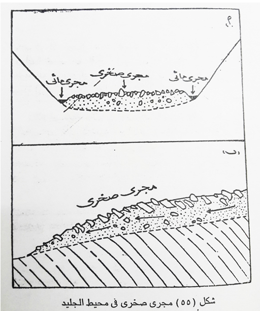 وتتعرض مواد حشو الوادي ذاتها أحيانا لتأثير عملية الانسياب الارضي نحو أدنى الوادي. وتتضمن العملية رفع الحطام الصخري الخشن بواسطة فعل الصقيع الى السطح، الذي ما يلبث ان يميل في اتجاه أعلى الوادي بواسطة رد فعل تدفق مواد التربة السفلى في اتجاه أدنى الوادي، وتتخذ كتلة المواد المتحركة مقطعا عرضيا محدبا، وعند حضيض كل من جانبي الوادي تجرى المياه في مجرى مائي، يفصلهما عن بعضها رواسب حشو الوادي المحدبة التي تعرف باسم المجرى الصخري Rock Stream (شكل 55).
