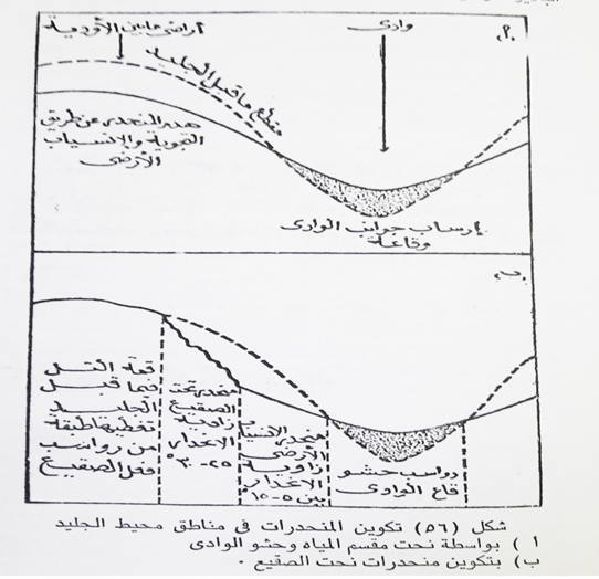 وينشأ عن العلميات المورفولوجية في مناطق هواشم الجليد عموما الى خفض التضاريس، وذلك عن طريق عمليتين هما: نحت مناطق ما بين الانهار، ثم ارساب وردم قيعان الاودية (شكل 56أ) وبذلك يقل الفارق الرأسي بين عنصري التضرس: الارتفاع والانخفاض. ويرى كثير من البحاث أن البيئات الطبيعية اللطيفة التموج، التي تتميز بها سهول ساليزبوري Salisboury وبيكاردي Picardy وأوتوا Artois على سبيل المثال، والتي تتصف بمقاطع منحدرات هينة التقوس، وبارسابات عظيمة من المواد الصخرية التي فتتها فعل الصقيع، والتي تحو أودية ضحلة، قد نشأت ابان فترات جليد الزمن الرابع بفعل العمليات المورفولوجية في مناطق محيط الجليد خاصة فعل الصقيع والانهيار الارضي، ومن ثم فهي بمثابة ((حفرية)) باقية من تأثيرات ظروف مناخية شبة قطبية سالفة.