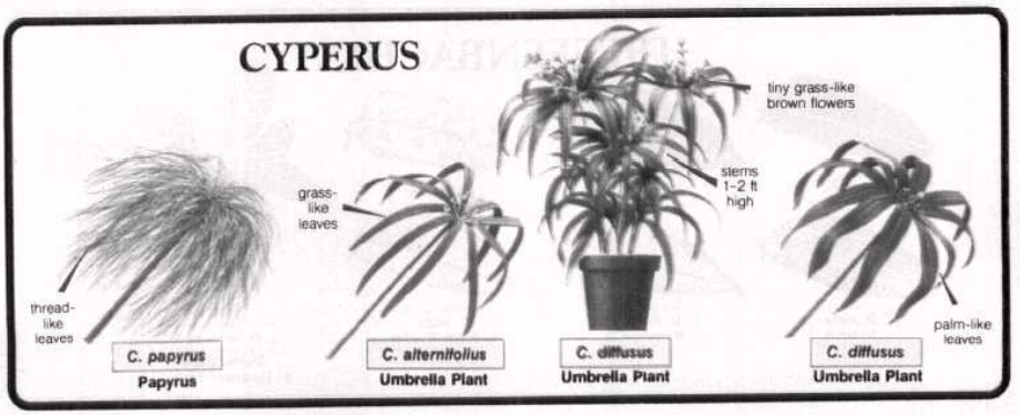 -C. papyrus (Papyrus) ارتفاعه 240-150 سم. كان قدماء المصريين يصنعون الورق من هذا النبات، إلا أنه أطول من اللازم ولا يناسب التنسيق الداخلي في المنازل.