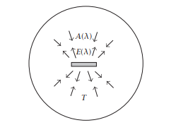 شكل 5-2: الانبعاثية والامتصاصية: عند تسخين مادة، فإنها تشع موجات كهرومغناطيسية. يتبع طيف قدرة الإشعاع الأقصى قانون بلانك. وفي الحالة العامة، يُطلق على الإشعاع الفعلي من أي سطح، بوصفه جزءًا من إشعاع الجسم الأسود عند طول موجي معني، اسم (انبعاثيته)، E (λ) وعند التوازن الحراري، يجب أن تساوي طاقة الإشعاع الصادرة طاقة الإشعاع الممتصة؛ ومن ثَم فإن = A (λ) E (λ)