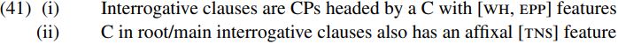 The [WH, EPP] features of C trigger movement of a wh-expression to spec-CP; and the affixal [TNS] feature carried by C in main-clause questions triggers movement of an auxiliary or tense affix from T to C (with a moved tense affix requiring concomitant do-support).