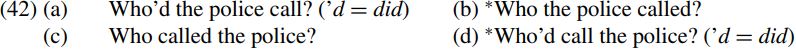 What we might expect to happen at this point is for the [WH, EPP] features of C to attract who to move to spec-CP, and for the [TNS] feature of C to attract movement of the Tns affix from T to C, with the dummy auxiliary do being attached to the affix in the PF component in order to provide it with a host. But such a derivation would wrongly predict that (42d) ∗Who’d call the police? is grammatical on the relevant interpretation (where ’d is a contracted form of did). So it would seem that the [TNS] feature of C does not attract the head T constituent of TP. So what does it attract?