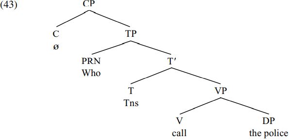 On this view, the derivation of (42c) would proceed as follows. The determiner the merges with the noun police to form the DP the police. This DP is then merged with the verb call to form the VP call the police. The resulting VP is in turn merged with a past-tense affix Tns, forming the T-bar Tns call the police. This T-bar is then merged with the pronoun who, forming the TP who Tns call the police. If we follow Agbayani (2000) in supposing that all interrogative clauses are CPs, the resulting TP will be merged with an interrogative C to form the CP shown in simplified form below: