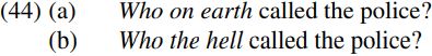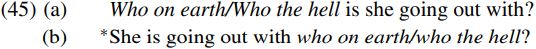 As Pesetsky (1987) notes (and as the examples in (45) below illustrate), wh-expressions like who on earth and who the hell have the property that they cannot remain in situ, but rather must move to spec-CP: