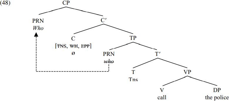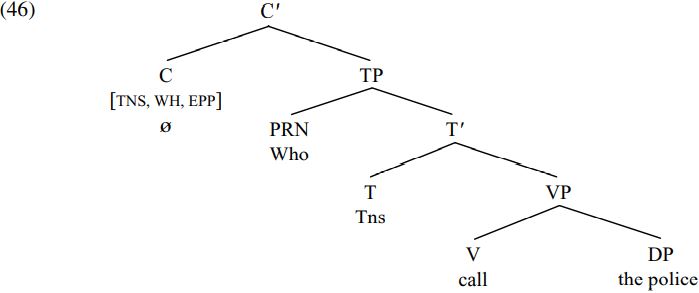 Let’s therefore follow Pesetsky and Torrego in taking all wh-questions (including wh-subject questions) to be CPs which show movement of a wh-expression to spec-CP. In particular, let’s suppose that after the TP who Tns call the police has been formed, it is merged with an interrogative C constituent which carries [TNS, WH, EPP] features, so forming the structure in (46) below (cf. (43) above):