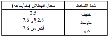 أما عملياً فتوجد الصور المختلفة للتساقط المذكورة آنفاً متداخلة فيما بينها لتكون التساقط الهاطل بالمنطقة. وبين جدول (1) تقدير شدة التساقط من خفيفة، ومتوسطة، وغزيرة.