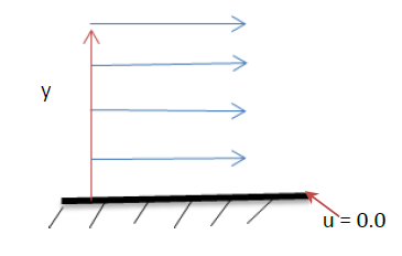لاحظ ان طبقة المائع الملامسة للسطح في حالة سكون ثم تزداد السرعة حسب البعد y من السطح.