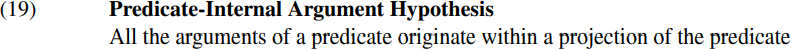 In other words, the arguments of a verb are typically its subject and complement(s). It has been widely assumed in work spanning more than half a century that complements of verbs are contained within a projection of the verb – e.g. the suspect in (18b) is the direct-object complement of arrested and is contained within the verb phrase headed by arrested (so that arrested the suspect is a VP). Under the VP-Internal Subject Hypothesis, we can go further than this and make the following (more general) claim: