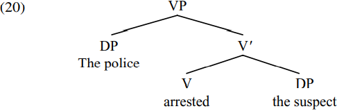 To see what this means in practice, consider the derivation of (18b) The police have arrested the suspect. The verb arrested merges with its direct-object complement the suspect (a DP formed by merging the determiner the with the noun suspect) to form the V-bar arrested the suspect. The resulting V-bar is in turn merged with the subject DP the police (formed by merging the determiner the with the noun police) to form the VP shown in (20) below (simplified by not showing the internal structure of the two DPs):