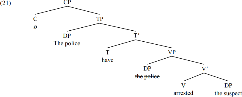 Under the analysis in (21), the argument structure of the verb arrest is directly reflected in the internal structure of the VP which it heads, since the suspect is the internal (direct-object) argument of arrested and the police was initially merged as its external (subject) argument – and indeed a null copy of the police is left behind in spec-VP, marking the spec-VP position as associated with the police.
