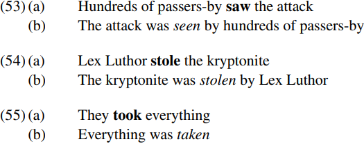 There are four main properties which differentiate passive sentences from their active counterparts. One is that passive (though not active) sentences generally require the auxiliary BE. Another is that the main verb in passive sentences is in the passive participle form (cf. seen/stolen/taken), which is generally homophonous with the perfect-participle form. A third is that passive sentences may (though need not) contain a by-phrase in which the complement of by plays the same thematic role as the subject in the corresponding active sentence: for example, hundreds of passers-by in the active structure (53a) serves as the subject of saw the attack, whereas in the passive structure (53b) it serves as the complement of the preposition by (though in both cases it has the thematic role of EXPERIENCER argument of see). The fourth difference is that the expression which serves as the complement of an active verb surfaces as the subject in the corresponding passive construction: for example, the attack is the complement of saw in the active structure (53a), but is the subject of was in the passive structure (53b). We will focus on the syntax of the superficial subjects of passive sentences (setting aside the derivation of by-phrases).