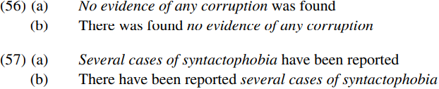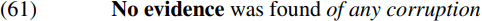 Sentences such as (61) thus provide us with empirical evidence that passive subjects originate as complements, on the assumption that of any corruption is a remnant of the preposed complement no evidence of any corruption.