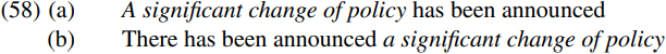 Passive predicates resemble unaccusatives in that alongside structures like those in (56a)–(58a) below containing preverbal subjects they also allow expletive structures like (56b)–(58b), in which the italicized argument can be postverbal (providing it is an indefinite expression):