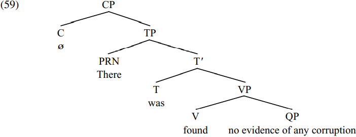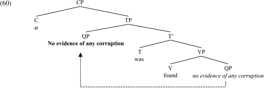However, an alternative way of satisfying the [EPP] feature of T is not to merge there in spec-TP but rather to passivise the QP no evidence of any corruption – i.e. to move it from being the thematic object of found to becoming the structural subject of was. Merging the resulting TP with a null complementizer which marks the sentence as declarative in force derives the CP shown in simplified form in (60) below (with the dotted arrow showing the movement which took place on the TP cycle):