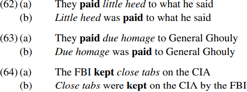 In expressions such as pay heed/homage to and keep tabs on, the verb pay/keep and the noun expression containing heed/tabs/homage together form an idiom. Given our arguments that idioms are unitary constituents, it is apparent that the bold-printed verb and the italicized noun expression must form a unitary constituent when they are first introduced into the derivation. This will clearly be the case if we suppose that the noun expression originates as the complement of the associated verb (as in (62a)–(64a)), and becomes the subject of the passive auxiliary was/were in (62b)–(64b) via passivisation/A-movement.