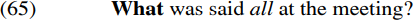 Recall from our earlier discussion of sentences like (37) that McCloskey argues that stranded quantifiers modifying wh-expressions are left behind via movement of the wh-expression without the quantifier. This being so, sentences such as (65) provide evidence that what all originates as the complement of the passive participle said (with what subsequently being passivized on its own, stranding all) – and more generally, that passive subjects are initially merged as thematic objects.