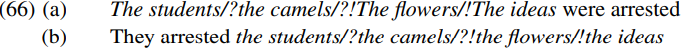 Since passive subjects like those italicized in (66a) originate as complements, they will have the same θ-role (and hence be subject to the same pragmatic restrictions on argument choice) as active complements like those italicized in (66b).
