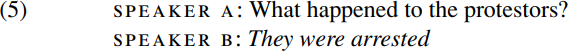 Here, discourse factors determine that a third-person-plural pronoun is required in order to refer back to the third-person-plural expression the protestors, and that a past-tense auxiliary is required because the event described took place in the past. So (as it were) the person/number features of they and the past-tense feature of were are determined in advance, before the items enter the derivation. By contrast the case feature assigned to they and the person/number features assigned to were are determined via an agreement operation in the course of the derivation: e.g. if the subject had been the singular pronoun one, the auxiliary would have been third person singular via agreement with one (as in One was arrested); and if THEY had been used as the object of a transitive verb (as in The police arrested them), it would have surfaced in the accusative form them rather than the nominative form they.