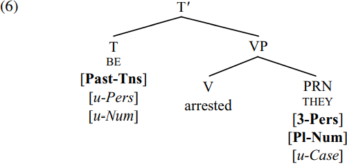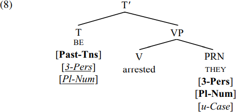 Since all the features carried by BE are now valued, BE can ultimately be spelled out in the phonology as the third-person-plural past-tense form were. Likewise, since all the features carried by THEY are also valued, they can ultimately be spelled out as the third-person-plural nominative form they. However, the derivation in (8) is not yet terminated: the [EPP] feature of T will subsequently trigger A-movement of they to become the structural subject of were, and the resulting TP they were arrested they will then be merged with a null declarative complementizer to form the structure ø they were arrested they: but since our immediate concern is with case and agreement, we skip over these details here.