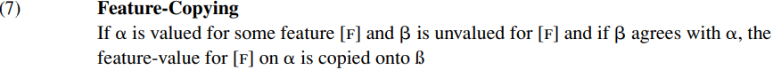 -features on the probe are valued by the goal, and an unvalued case feature on the goal is valued by the probe. (In Chomsky’s use of these terms, it is the unvalued person/number features which serve as the probe rather than the item BE itself, but this is a distinction which we shall overlook throughout, in order to simplify exposition.) Since [T BE] is the highest head in the structure (6), it serves as a probe which searches for a c-commanded goal with an unvalued case feature, and locates the pronoun they. Accordingly, an agreement relation is established between the probe BE and the goal THEY. One reflex of this agreement relation is that the unvalued person and number features carried by the probe BE are valued by the goal THEY. Valuation here involves a Feature-Copying operation which we can sketch in general terms as follows (where
