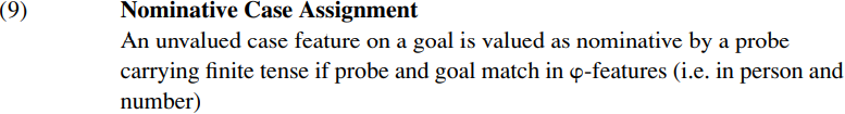 Although we have given an essentially Chomskyan account of nominative case-marking in (9) and will continue to use it, a theoretically more elegant account would be to make use of Pesetsky and Torrego’s assumption that nominative case is a manifestation of a tense feature on T. On this alternative view, the [u-Case] feature on THEY in (8) would be replaced by a [u-Tense] feature which is valued as [Past-Tense] by the Feature-Copying operation in (7), with any (present- or past-) tensed form of the pronoun being spelled out as they. This solution is more elegant in two respects. Firstly, it eliminates the need for a Nominative Case Assignment operation, since nominative case assignment becomes a tense-copying operation which is simply a particular instance of the Feature-Copying operation in (7). Secondly, it avoids a potential violation of a UG principle which Chomsky terms the Inclusiveness Condition and which he says (1999, p. 2) ‘bars introduction of new elements (features) in the course of a derivation’. Under the analysis sketched in (8), THEY enters the derivation with an unvalued case feature which is then assigned the value nominative via agreement with a T constituent which has person, tense and number features. So it would seem that the value nominative is introduced into the derivation via a case-valuation operation like (9), leading to a potential violation of the Inclusiveness Condition. By contrast, under the alternative tense-copying analysis of nominative case, no new feature value is introduced into the derivation: instead, the existing [Past] value for the [Tns] feature on T is copied onto the subject.