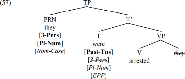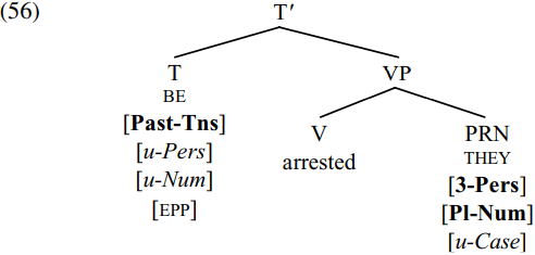 In (56), [T BE]is an active probe (by virtue of its uninterpretable person and number features) and has an uninterpretable [EPP] feature. It therefore searches for active nominal goals which can value and delete its person/number features, locating the pronoun THEY (which is active by virtue of its uninterpretable case feature and which has person and number features which match those of BE).